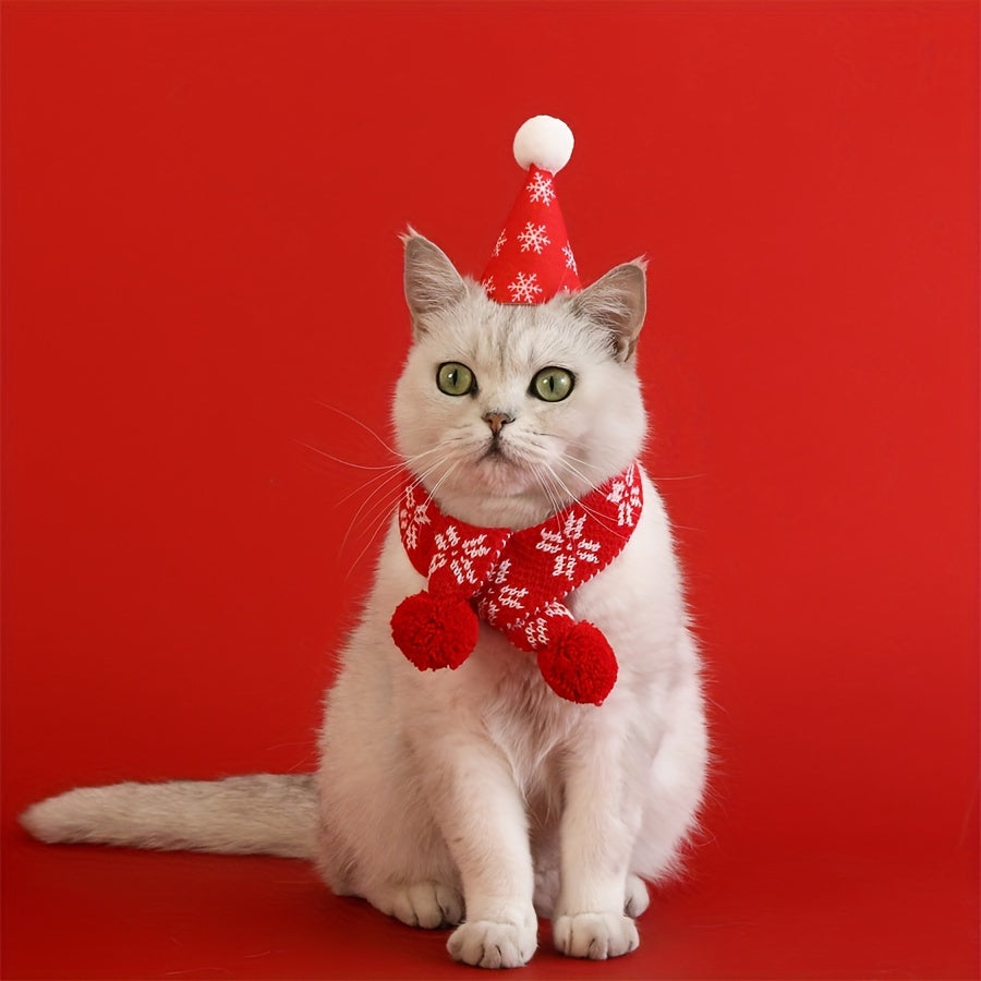 Pet Christmas Collar & Hat Set – Plaid Pattern with Pom-Pom